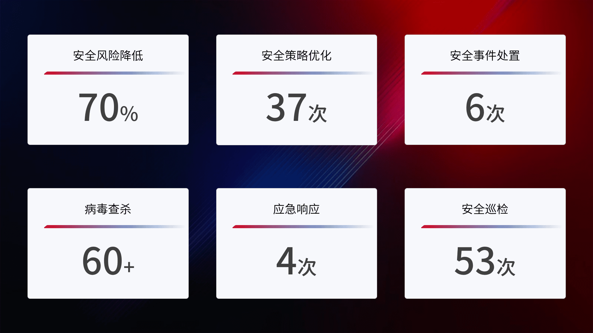 提供全面的安全事件报告体系,,,包括处置报告、、、周报、、季度和年度总结,,,,结合持续监控,,帮助客户深入了解网络安全状况。。。